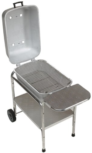 Reproduced from an original 1950's design, this heavy-duty cast aluminum charcoal grill radiates heat so food cooks more evenly-without constant turning. With the lid closed, food is bathed in smoke for an unforgettable flavor. Thick cast aluminum construction will never rust. Unique venting system for perfect temperature control. Smokes as well as it grills. Detaches from carriage for easy travel. Hinged cooking grid for easy refueling.